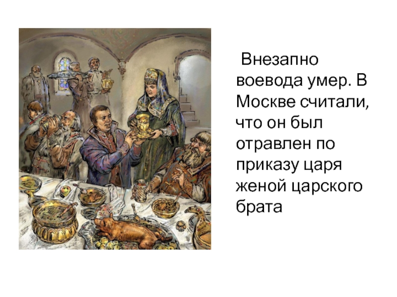 Слайд 44 Внезапно воевода умер. В Москве считали, что он был отравлен