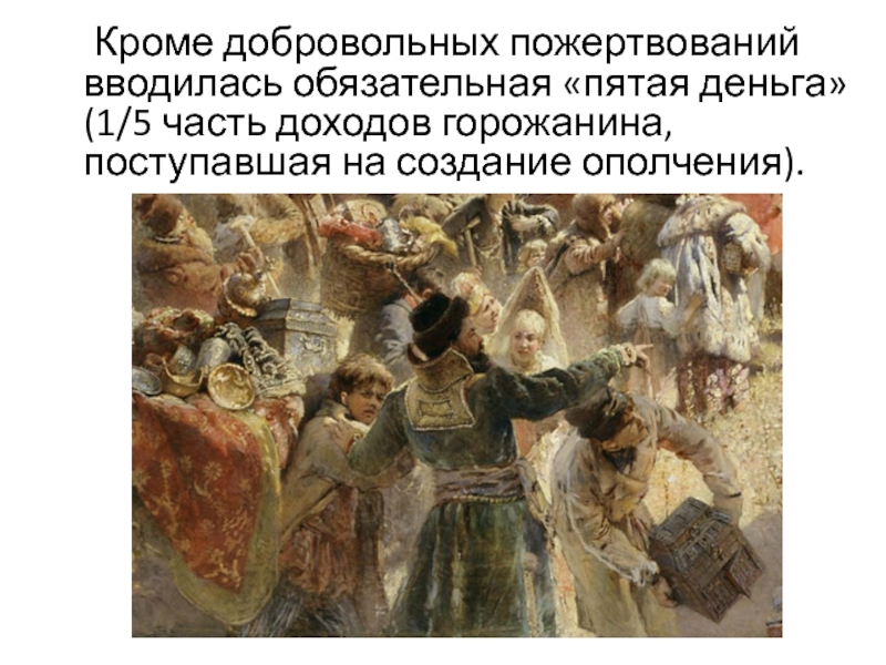Слайд 60 Кроме добровольных пожертвований вводилась обязательная «пятая деньга» (1/5 часть доходов