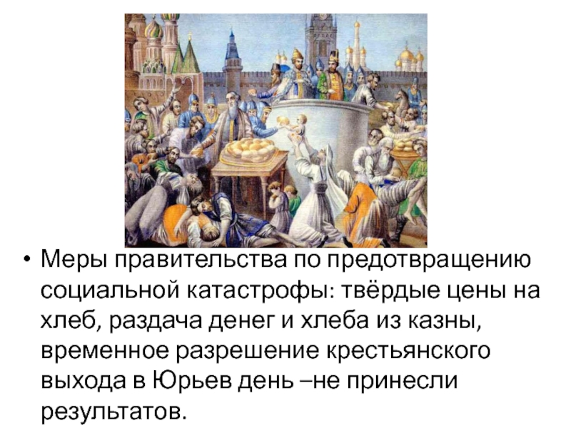 раздача денег и хлеба из казны, временное разрешение крестьянского выхода