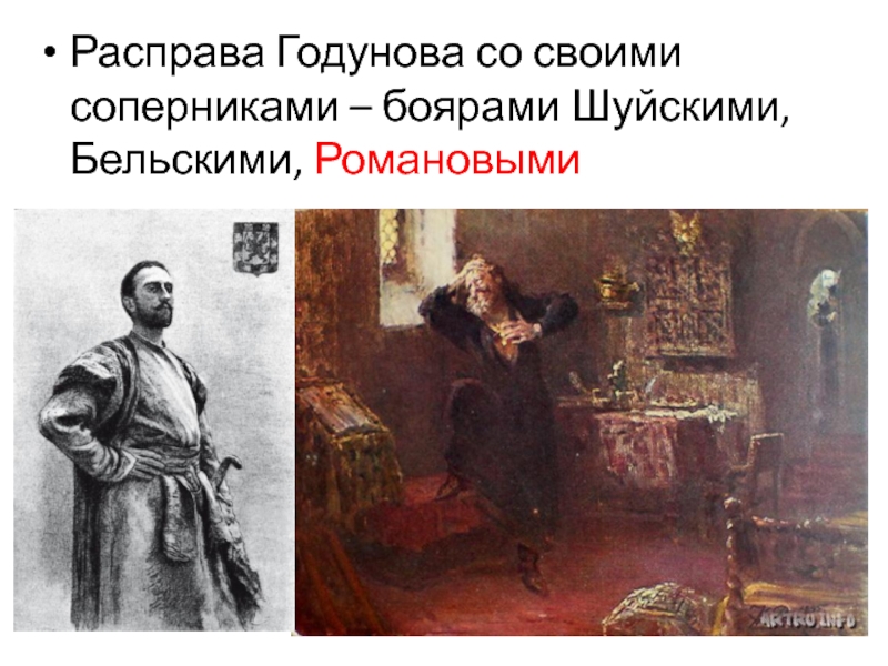 Слайд 16Расправа Годунова со своими соперниками – боярами Шуйскими, Бельскими, Романовыми