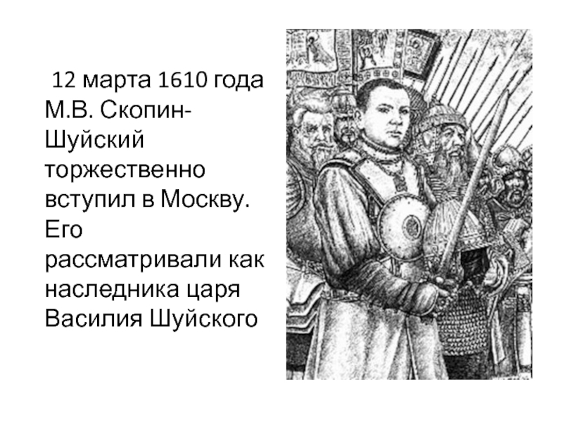 Слайд 43 12 марта 1610 года М.В. Скопин-Шуйский торжественно вступил в Москву.