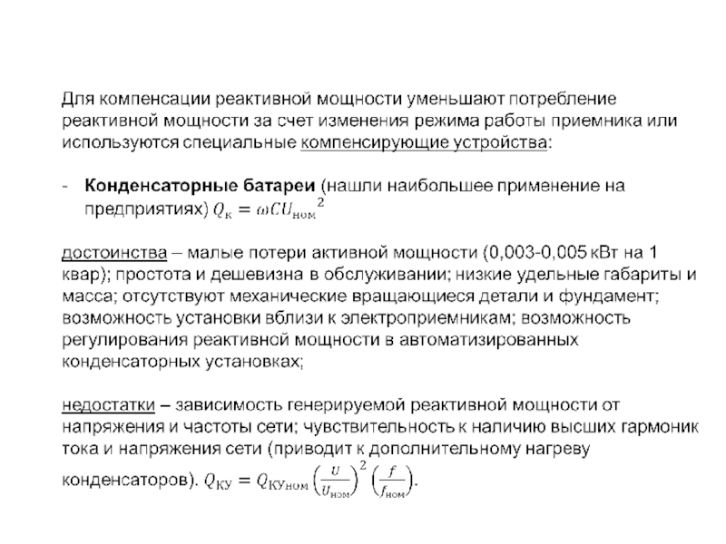 Как правило, на предприятиях со спокойной нагрузкой для компенсации реактивной мощности применяются статические конденсаторы с регулируемой емкостью батарей и СД, работающие в режиме перевозбуждения.