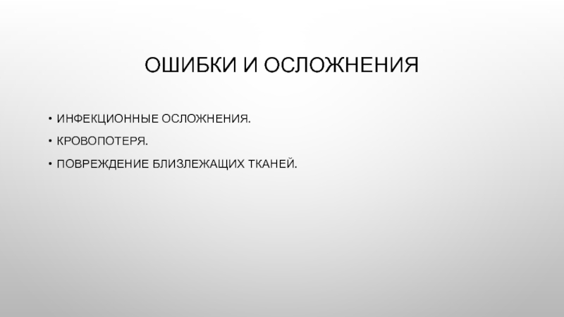 Ошибки и осложнения Инфекционные осложнения.Кровопотеря. Повреждение близлежащих тканей.