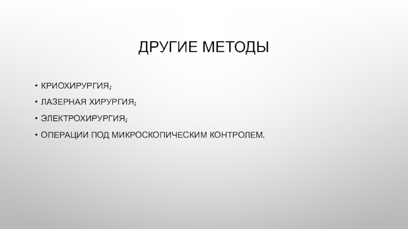 Другие методыКриохирургия;Лазерная хирургия;Электрохирургия;Операции под микроскопическим контролем.