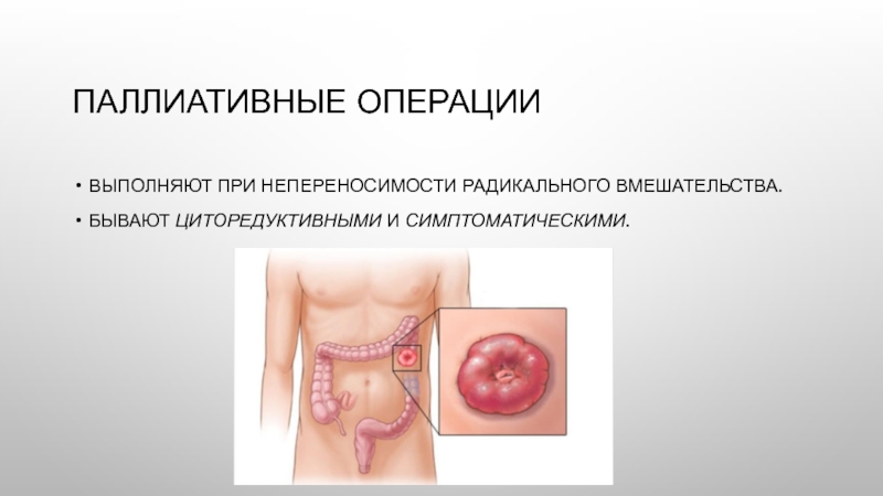 Паллиативные операции Выполняют при непереносимости радикального вмешательства. Бывают циторедуктивными и симптоматическими.