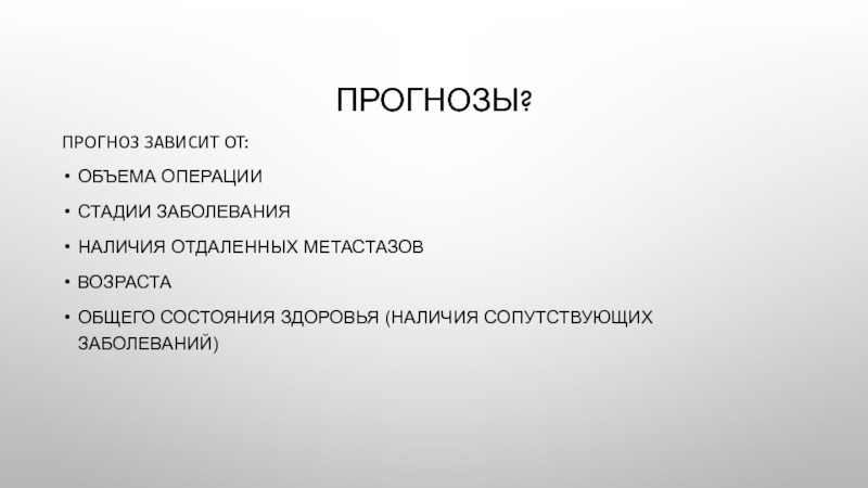 Прогнозы? Прогноз зависит от:объема операциистадии заболеванияналичия отдаленных метастазоввозрастаобщего состояния здоровья (наличия сопутствующих заболеваний)