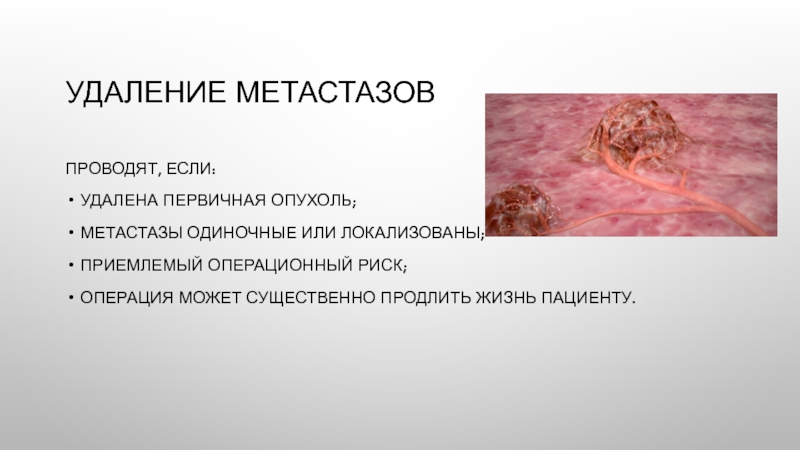 Удаление метастазов Проводят, если:удалена первичная опухоль;метастазы одиночные или локализованы;приемлемый операционный риск;операция может существенно продлить жизнь пациенту.