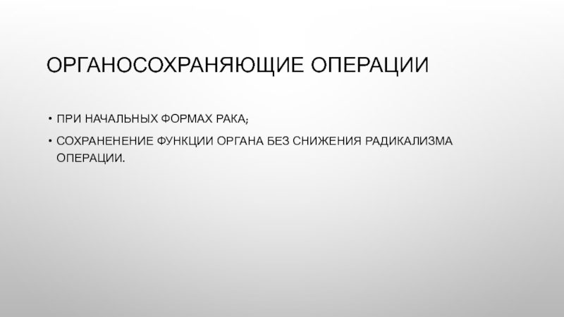 Органосохраняющие операцииПри начальных формах рака;Сохраненение функции органа без снижения радикализма операции.