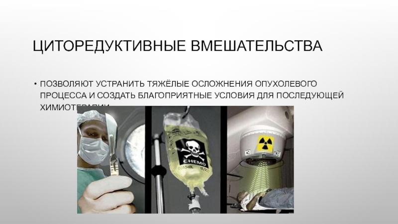 Циторедуктивные вмешательства Позволяют устранить тяжёлые осложнения опухолевого процесса и создать благоприятные условия для последующей химиотерапии.