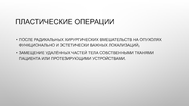 Пластические операции После радикальных хирургических вмешательств на опухолях функционально и эстетически важных локализаций;Замещение удалённых частей тела собственными