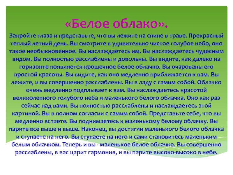 чистое голубое небо, оно такое необыкновенное. Вы наслаждаетесь им. Вы наслаждаетесь чудесным видом. Вы полностью расслаблены и довольны. Вы видите, как далеко на горизонте появляется крошечное белое облачко. Вы очарованы его простой красоты. Вы видите, как оно медленно приближается к вам. Вы лежите, и вы совершенно расслаблены. Вы в ладу с самим собой. Облачко очень медленно подплывает к вам. Вы наслаждаетесь красотой великолепного голубого неба и маленького белого облачка. Оно как раз сейчас над вами. Вы полностью расслаблены и наслаждаетесь этой картиной. Вы в полном согласии с самим собой. Представьте себе, что вы медленно встаете. Вы поднимаетесь к маленькому белому облачку. Вы парите все выше и выше. Наконец, вы достигли маленького белого облачка и ступаете на него. Вы ступаете на него и сами становитесь маленьким белым облачком. Теперь и вы - маленькое белое облачко. Вы совершенно расслаблены, в вас царит гармония, и вы парите высоко-высоко в небе.