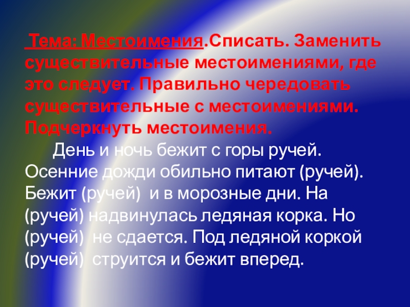 Тема: Местоимения.	Списать. Заменить существительные местоимени­ями, где это следует. Правильно чередовать существи­тельные с местоимениями. Подчеркнуть местоиме­ния.