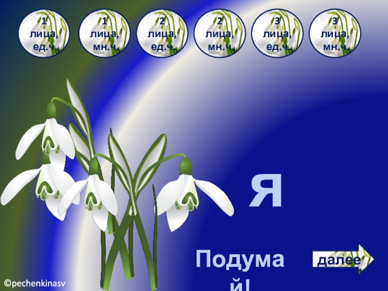 я1 лица, ед.ч.1 лица, мн.ч.2 лица, ед.ч.2 лица, мн.ч.3 лица, ед.ч.3 лица, мн.ч.далееПодумай!©pechenkinasv