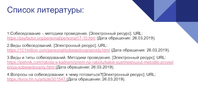 1.Собеседование – методики проведения. [Электронный ресурс]. URL: https://psyfactor.org/personal/personal17-10.htm (Дата