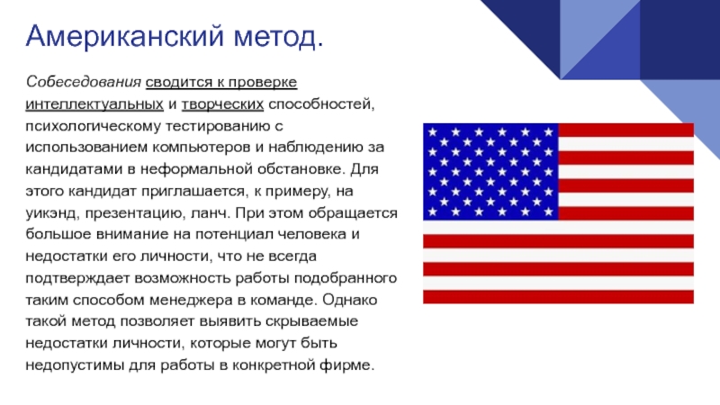 обстановке. Для этого кандидат приглашается, к примеру, на уикэнд, презентацию, ланч. При этом обращается большое внимание на потенциал человека и недостатки его личности, что не всегда подтверждает возможность работы подобранного таким способом менеджера в команде. Однако такой метод позволяет выявить скрываемые недостатки личности, которые могут быть недопустимы для работы в конкретной фирме.