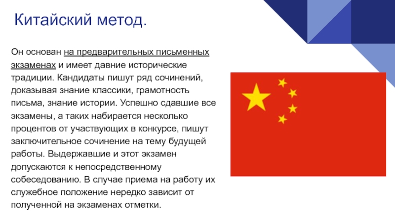 письма, знание истории. Успешно сдавшие все экзамены, а таких набирается несколько процентов от участвующих в конкурсе, пишут заключительное сочинение на тему будущей работы. Выдержавшие и этот экзамен допускаются к непосредственному собеседованию. В случае приема на работу их служебное положение нередко зависит от полученной на экзаменах отметки.