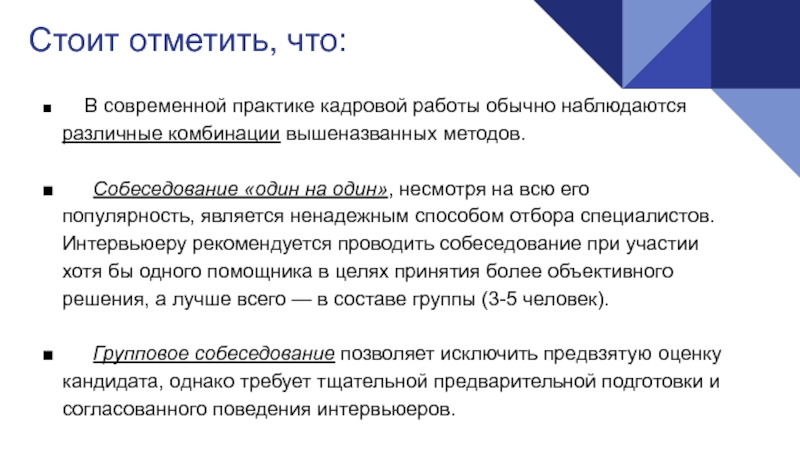 ■ Групповое собеседование позволяет исключить предвзятую оценку кандидата, однако требует тщательной предварительной подготовки и согласованного поведения интервьюеров.