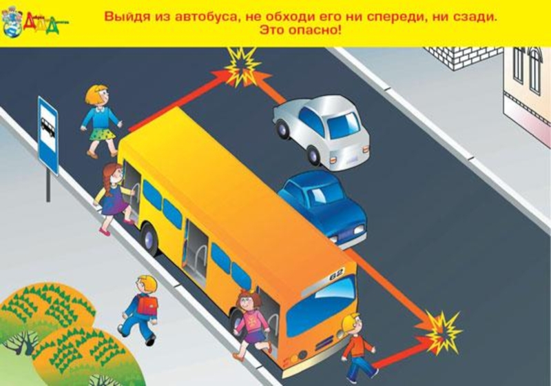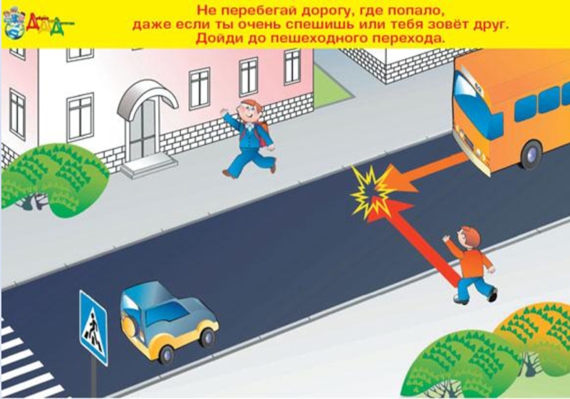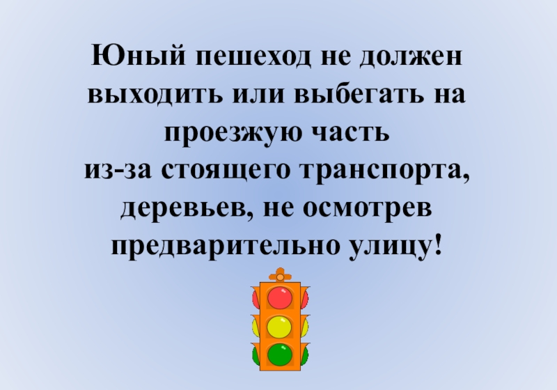 Юный пешеход не должен выходить или выбегать на проезжую часть из-за стоящего транспорта, деревьев, не осмотрев предварительно