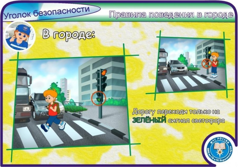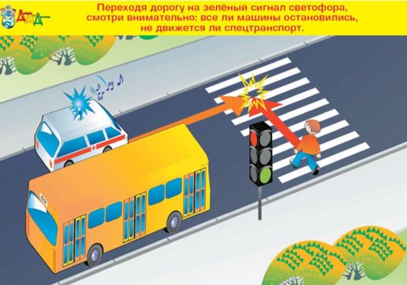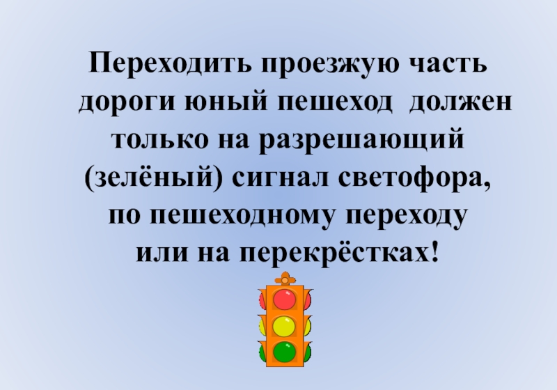 Переходить проезжую часть дороги юный пешеход должен только на разрешающий (зелёный) сигнал светофора, по пешеходному переходу или