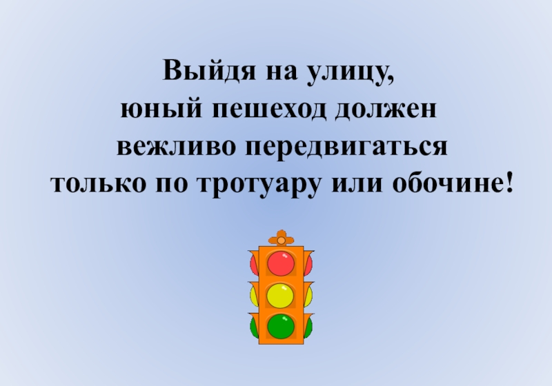 Выйдя на улицу, юный пешеход должен вежливо передвигаться только по тротуару или обочине!