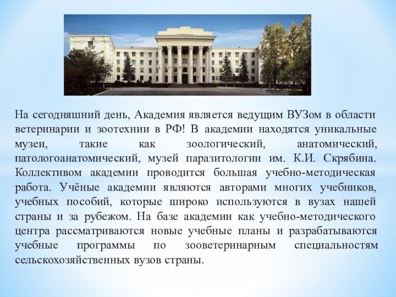 Слайд 2На сегодняшний день, Академия является ведущим ВУЗом в области ветеринарии