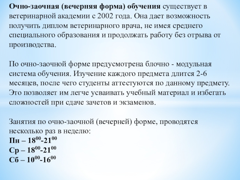 Слайд 6Очно-заочная (вечерняя форма) обучения существует в ветеринарной академии с 2002 года.