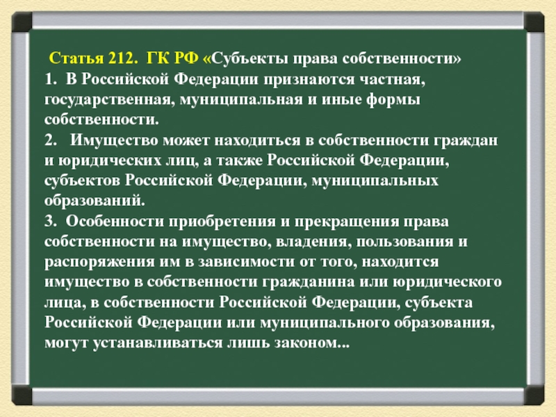 Ст.8 Конституции. В Российской Федерации признаются и защищаются равным образом частная ,государственная, муниципальная и иные формы собственности
