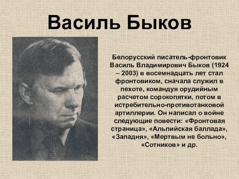 расчетом сорокопятки, потом в истребительно-противотанковой артиллерии. Он написал о войне следующие повести: «Фронтовая страница», «Альпийская баллада», «Западня», «Мертвым не больно», «Сотников» и др.