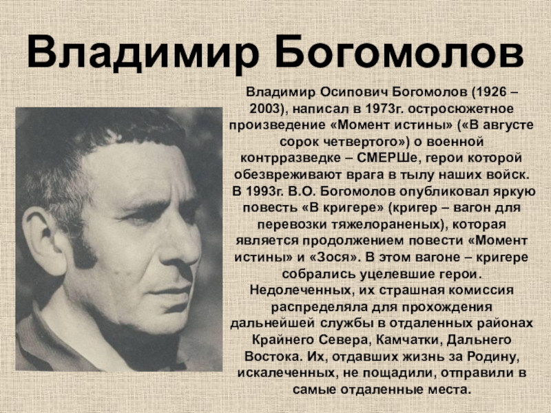 контрразведке – СМЕРШе, герои которой обезвреживают врага в тылу наших войск. В 1993г. В.О. Богомолов опубликовал яркую повесть «В кригере» (кригер – вагон для перевозки тяжелораненых), которая является продолжением повести «Момент истины» и «Зося». В этом вагоне – кригере собрались уцелевшие герои. Недолеченных, их страшная комиссия распределяла для прохождения дальнейшей службы в отдаленных районах Крайнего Севера, Камчатки, Дальнего Востока. Их, отдавших жизнь за Родину, искалеченных, не пощадили, отправили в самые отдаленные места.