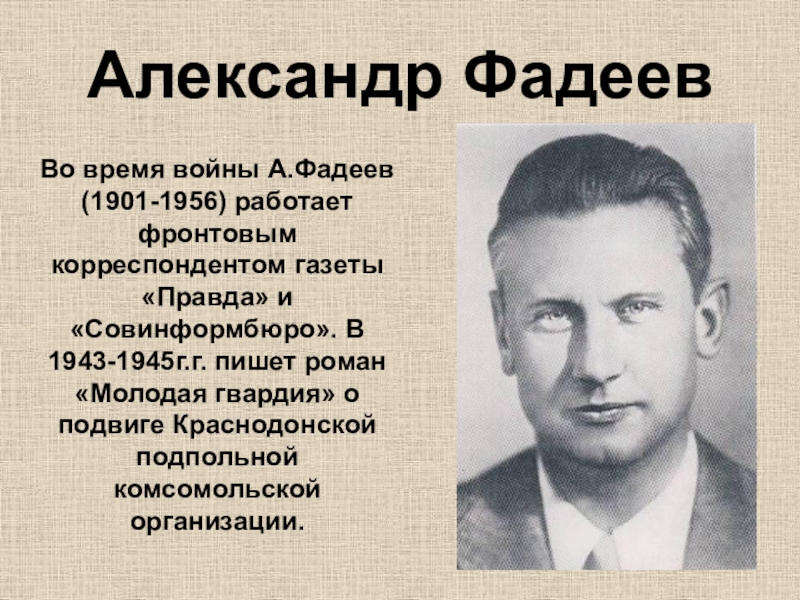 Во время войны А.Фадеев (1901-1956) работает фронтовым корреспондентом газеты