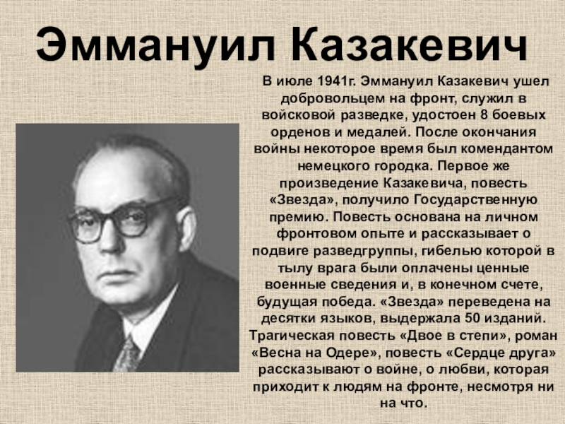 медалей. После окончания войны некоторое время был комендантом немецкого городка. Первое же произведение Казакевича, повесть «Звезда», получило Государственную премию. Повесть основана на личном фронтовом опыте и рассказывает о подвиге разведгруппы, гибелью которой в тылу врага были оплачены ценные военные сведения и, в конечном счете, будущая победа. «Звезда» переведена на десятки языков, выдержала 50 изданий. Трагическая повесть «Двое в степи», роман «Весна на Одере», повесть «Сердце друга» рассказывают о войне, о любви, которая приходит к людям на фронте, несмотря ни на что.