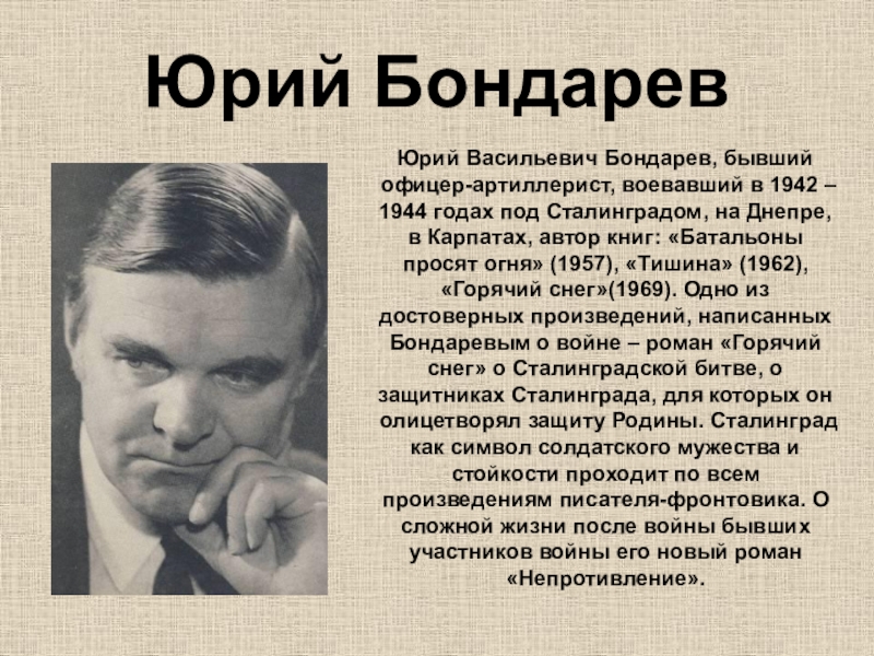 Юрий Васильевич Бондарев, бывший офицер-артиллерист, воевавший в 1942 –