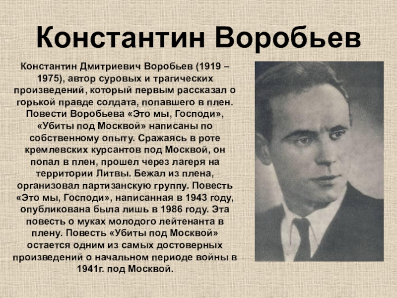 в плен. Повести Воробьева «Это мы, Господи», «Убиты под Москвой» написаны по собственному опыту. Сражаясь в роте кремлевских курсантов под Москвой, он попал в плен, прошел через лагеря на территории Литвы. Бежал из плена, организовал партизанскую группу. Повесть «Это мы, Господи», написанная в 1943 году, опубликована была лишь в 1986 году. Эта повесть о муках молодого лейтенанта в плену. Повесть «Убиты под Москвой» остается одним из самых достоверных произведений о начальном периоде войны в 1941г. под Москвой.