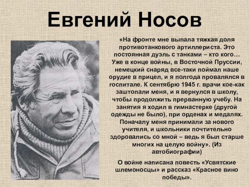 войны, в Восточной Пруссии, немецкий снаряд все-таки поймал наше орудие в прицел, и я полгода провалялся в госпитале. К сентябрю 1945 г. врачи кое-как заштопали меня, и я вернулся в школу, чтобы продолжить прерванную учебу. На занятия я ходил в гимнастерке (другой одежды не было), при орденах и медалях. Поначалу меня принимали за нового учителя, и школьники почтительно здоровались со мной – ведь я был старше многих на целую войну». (Из автобиографии)