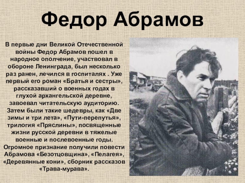 раз ранен, лечился в госпиталях . Уже первый его роман «Братья и сестры», рассказавший о военных годах в глухой архангельской деревне, завоевал читательскую аудиторию. Затем были такие шедевры, как «Две зимы и три лета», «Пути-перепутья», трилогия «Пряслины», посвященные жизни русской деревни в тяжелые военные и послевоенные годы. Огромное признание получили повести Абрамова «Безотцовщина», «Пелагея», «Деревянные кони», сборник рассказов «Трава-мурава».