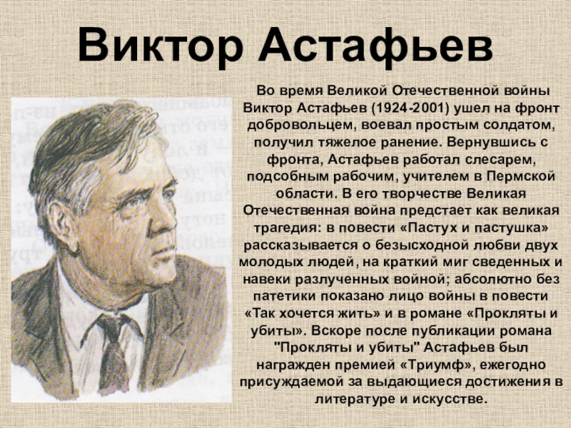 Вернувшись с фронта, Астафьев работал слесарем, подсобным рабочим, учителем в Пермской области. В его творчестве Великая Отечественная война предстает как великая трагедия: в повести «Пастух и пастушка» рассказывается о безысходной любви двух молодых людей, на краткий миг сведенных и навеки разлученных войной; абсолютно без патетики показано лицо войны в повести «Так хочется жить» и в романе «Прокляты и убиты». Вскоре после публикации романа "Прокляты и убиты" Астафьев был награжден премией «Триумф», ежегодно присуждаемой за выдающиеся достижения в литературе и искусстве.