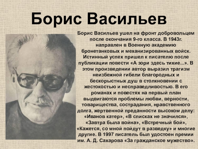 войск. Истинный успех пришел к писателю после публикации повести «А зори здесь тихие...». В этом произведении автор выразил трагизм неизбежной гибели благородных и бескорыстных душ в столкновении с жестокостью и несправедливостью. В его романах и повестях на первый план выдвигаются проблемы любви, верности, товарищества, сострадания, нравственного долга, жертвенной преданности высоком делу: «Иванов катер», «В списках не значился», «Завтра была война», «Встречный бой», «Кажется, со мной пойдут в разведку» и многие другие. В 1997 писатель был удостоен премии им. А. Д. Сахарова «За гражданское мужество».