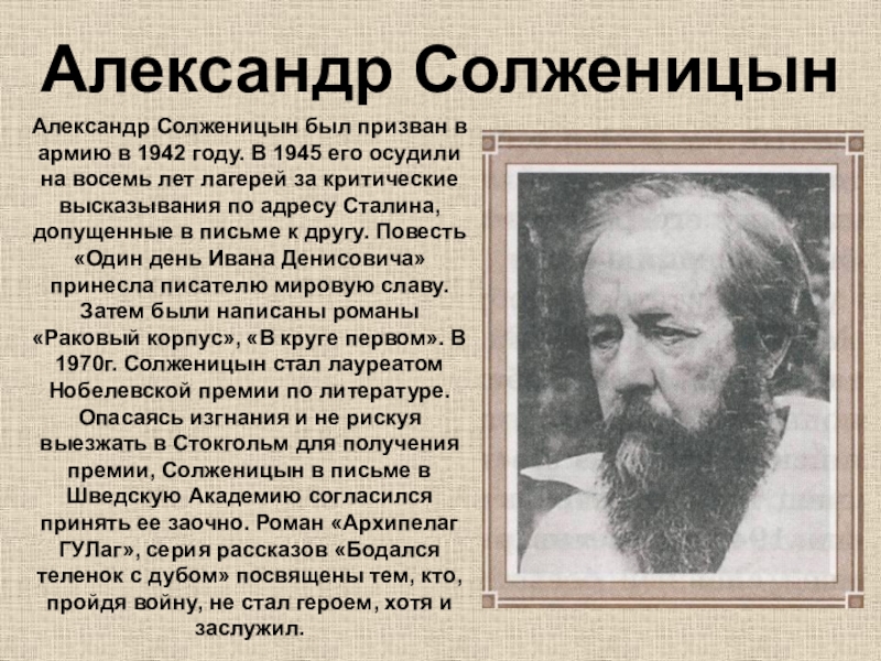 высказывания по адресу Сталина, допущенные в письме к другу. Повесть «Один день Ивана Денисовича» принесла писателю мировую славу. Затем были написаны романы «Раковый корпус», «В круге первом». В 1970г. Солженицын стал лауреатом Нобелевской премии по литературе. Опасаясь изгнания и не рискуя выезжать в Стокгольм для получения премии, Солженицын в письме в Шведскую Академию согласился принять ее заочно. Роман «Архипелаг ГУЛаг», серия рассказов «Бодался теленок с дубом» посвящены тем, кто, пройдя войну, не стал героем, хотя и заслужил.