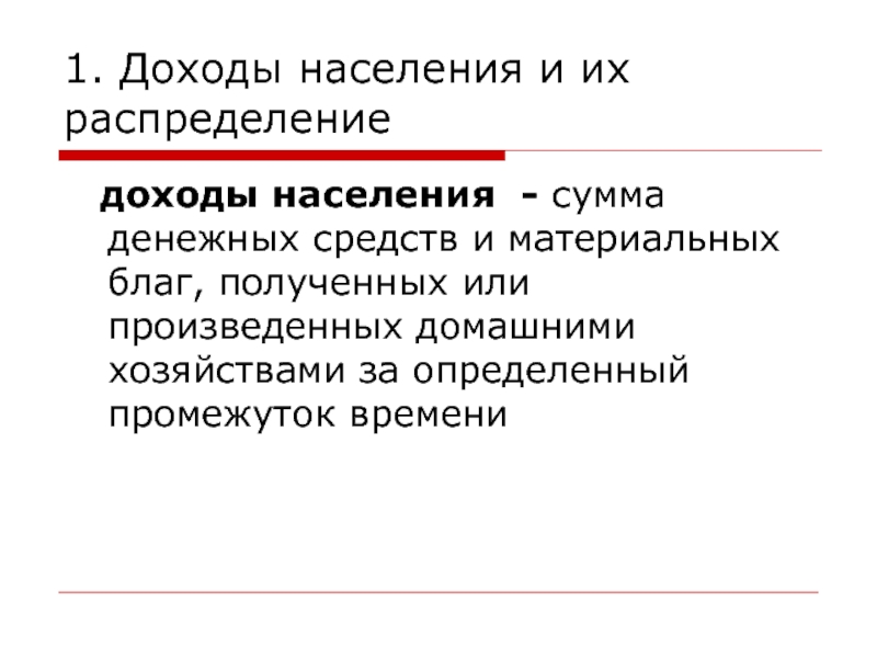 1. Доходы населения и их распределение  доходы населения - сумма денежных средств и материальных благ, полученных