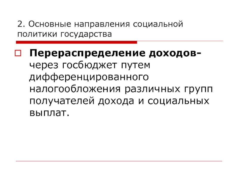 2. Основные направления социальной политики государстваПерераспределение доходов- через госбюджет путем дифференцированного налогообложения различных групп получателей дохода и