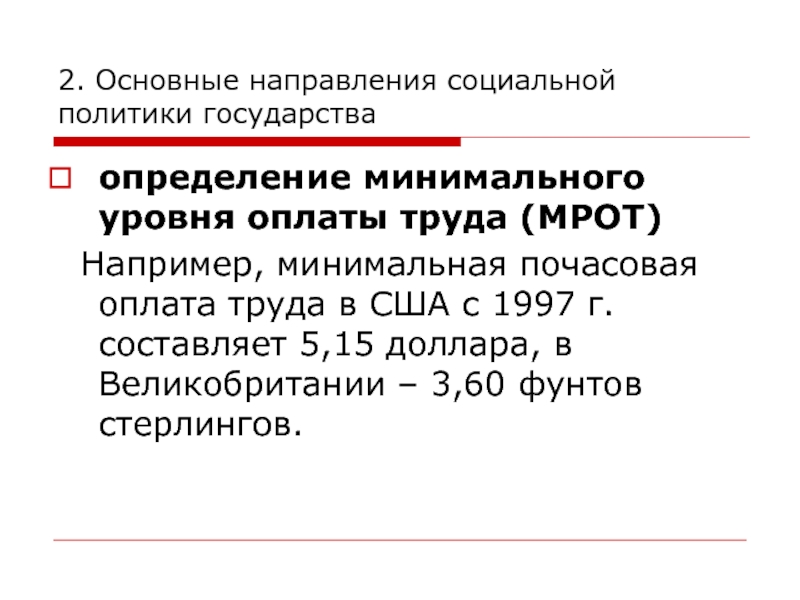 2. Основные направления социальной политики государстваопределение минимального уровня оплаты труда (МРОТ)  Например, минимальная почасовая оплата труда
