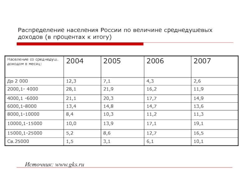 Распределение населения России по величине среднедушевых доходов (в процентах к итогу)Источник: www.gks.ru