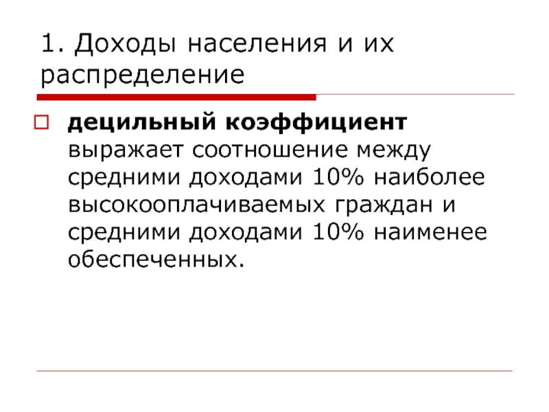1. Доходы населения и их распределениедецильный коэффициент выражает соотношение между средними доходами 10% наиболее высокооплачиваемых граждан и