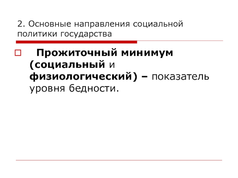 2. Основные направления социальной политики государства Прожиточный минимум (социальный и физиологический) – показатель уровня бедности.