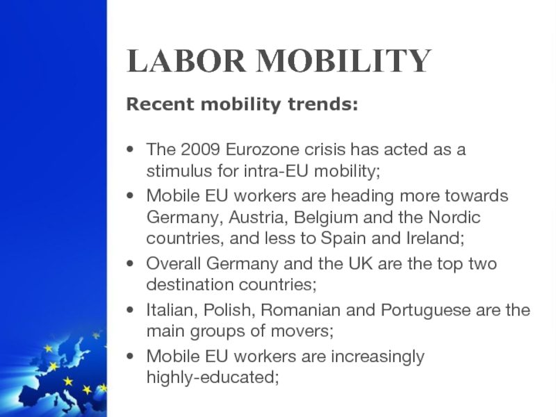 LABOR MOBILITYRecent mobility trends:The 2009 Eurozone crisis has acted as a stimulus for intra-EU mobility;Mobile EU workers