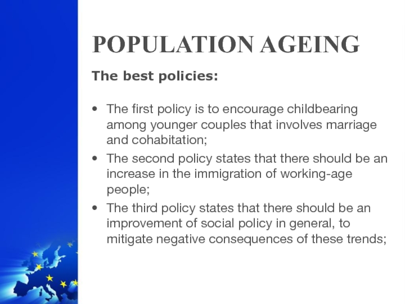 POPULATION AGEING  The best policies:The first policy is to encourage childbearing among younger couples that involves