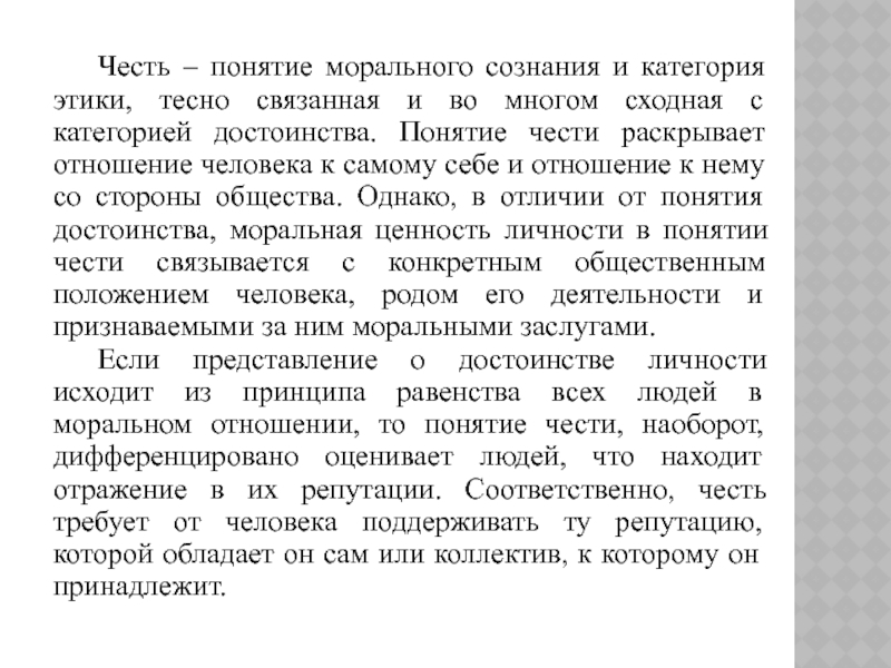 отношение человека к самому себе и отношение к нему со стороны общества. Однако, в отличии от понятия достоинства, моральная ценность личности в понятии чести связывается с конкретным общественным положением человека, родом его деятельности и признаваемыми за ним моральными заслугами.