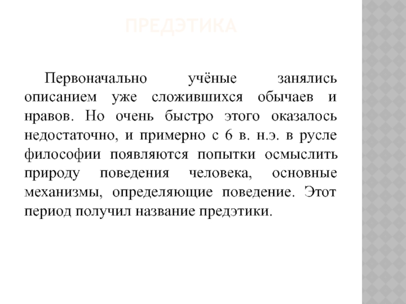 н.э. в русле философии появляются попытки осмыслить природу поведения человека, основные механизмы, определяющие поведение. Этот период получил название предэтики.