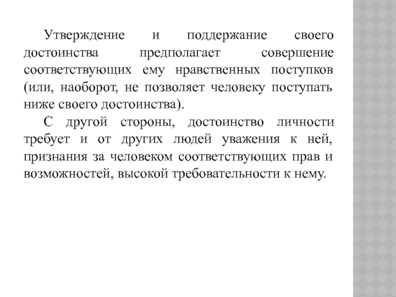 Слайд 38 Утверждение и поддержание своего достоинства предполагает совершение соответствующих ему нравственных
