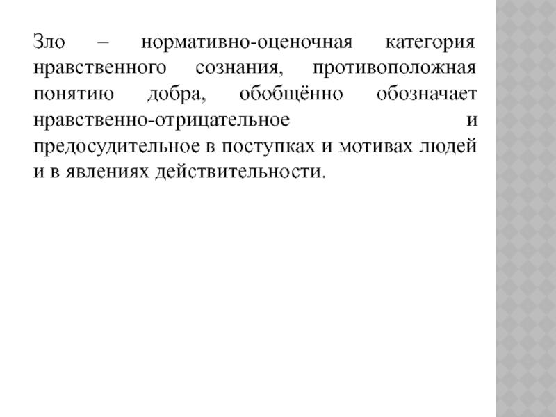 Слайд 29Зло – нормативно-оценочная категория нравственного сознания, противоположная понятию добра, обобщённо